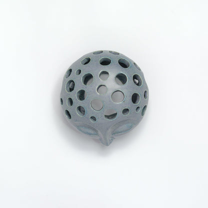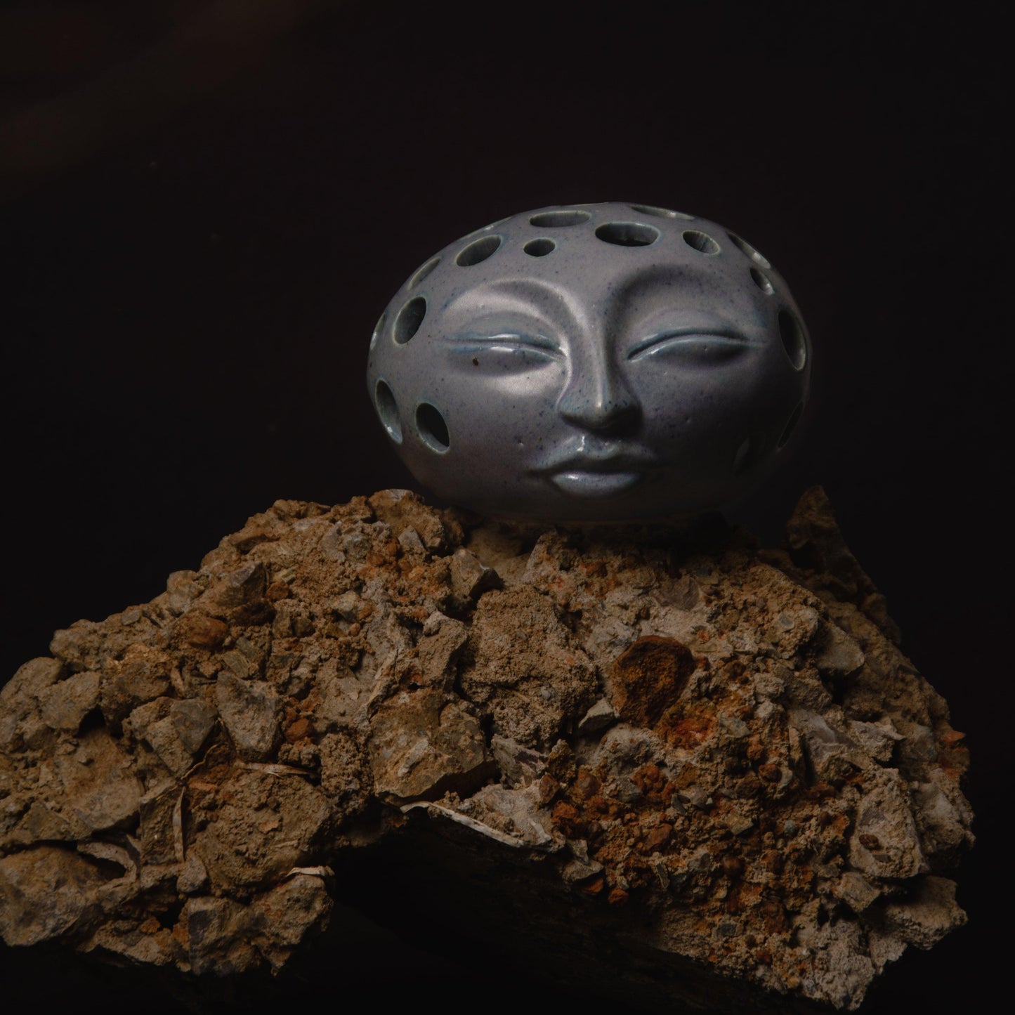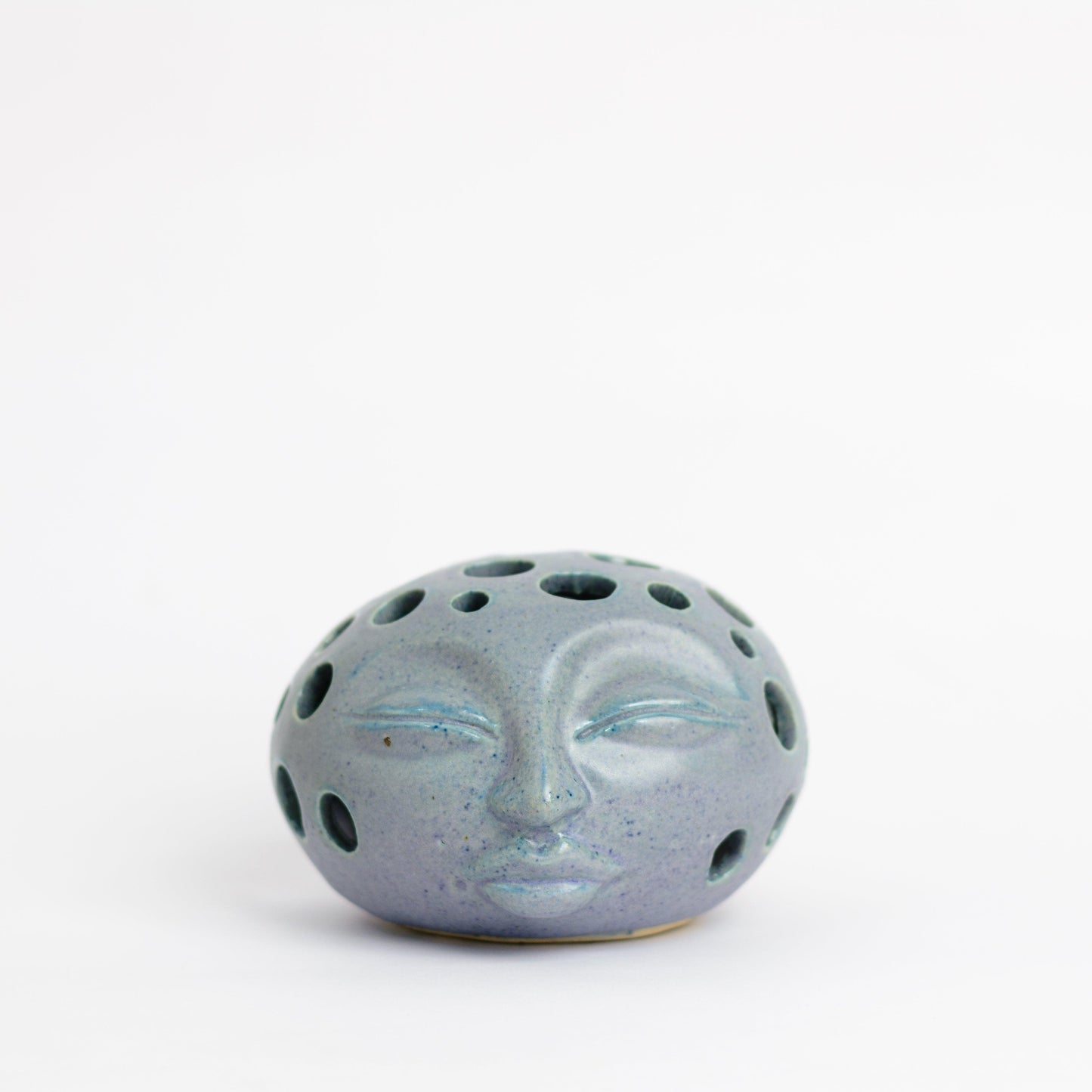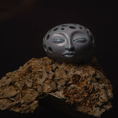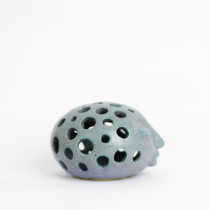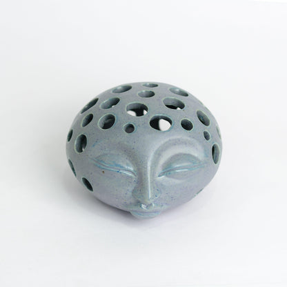 A hand-thrown stoneware tea-light holder, with sculpted details and a magical glaze giving a livid blue grey effect and speckled surface which shines where it sets.  It’s a calming little piece that’s an absolute beauty in the darkness.