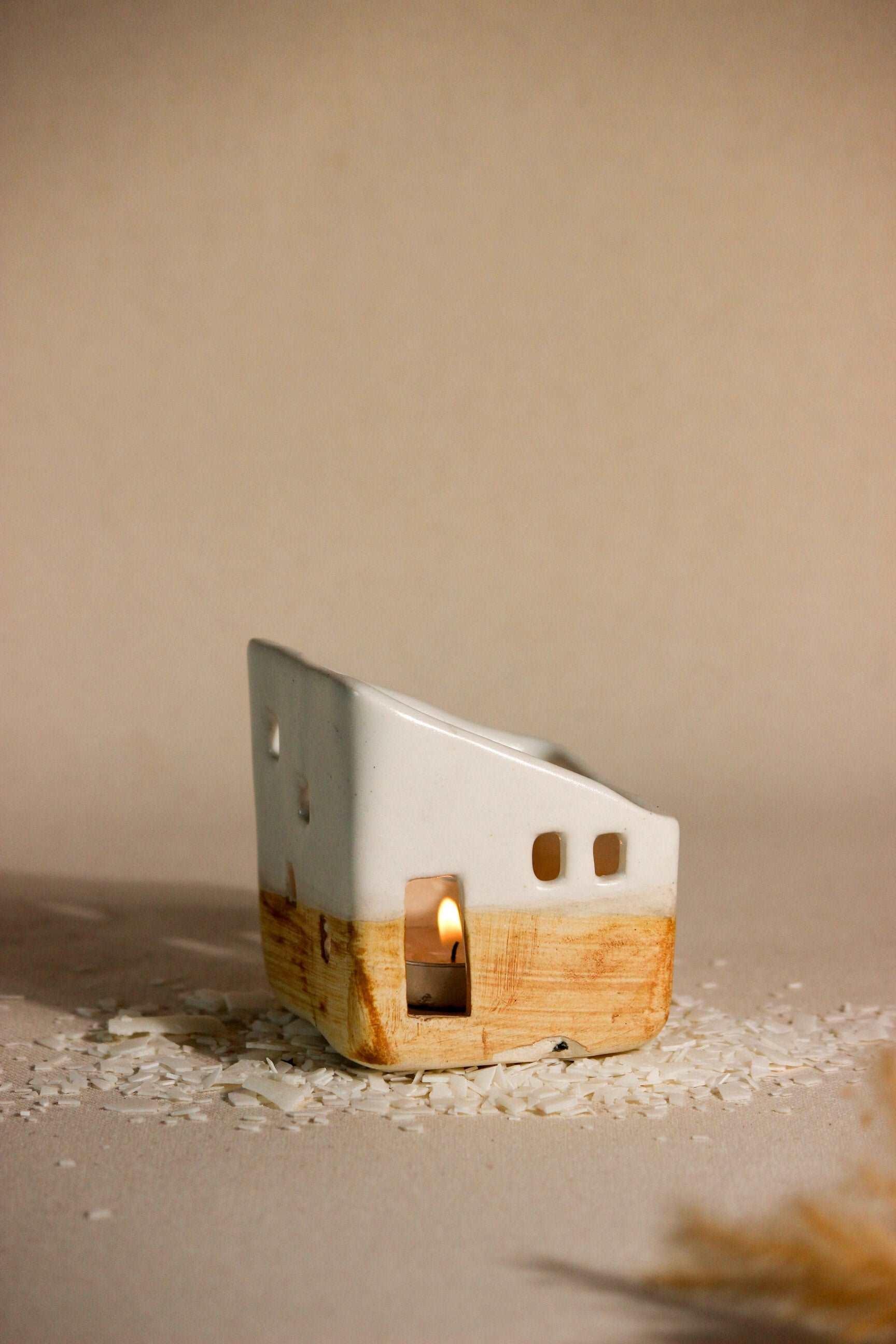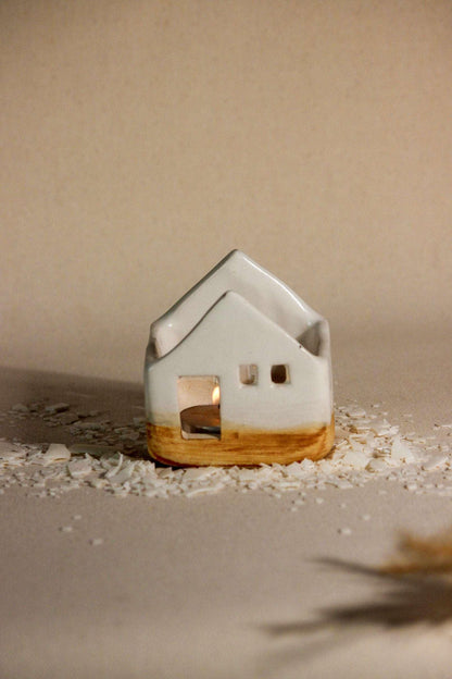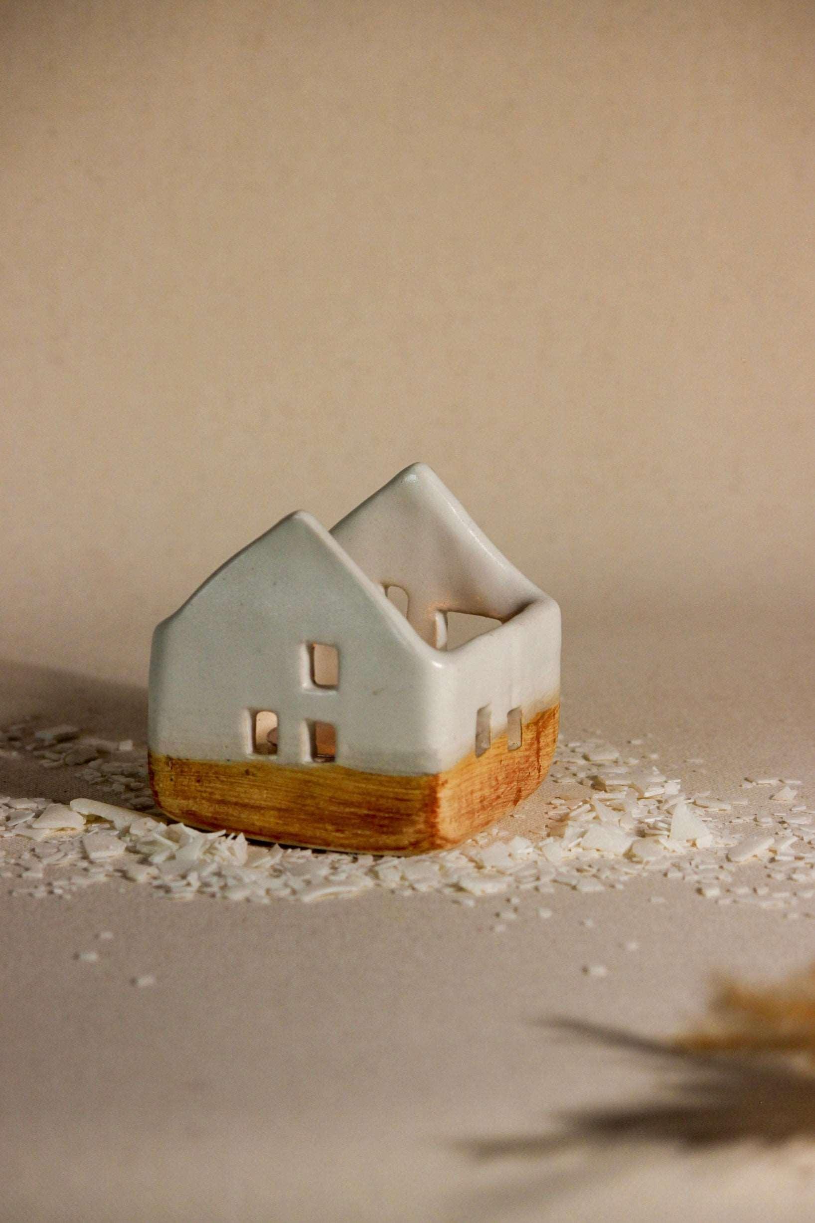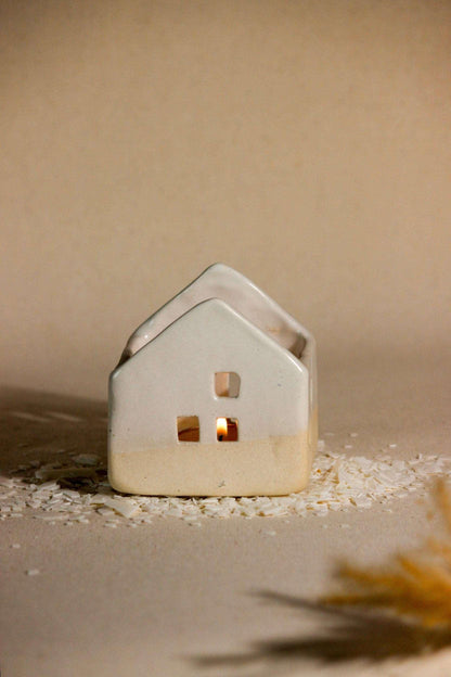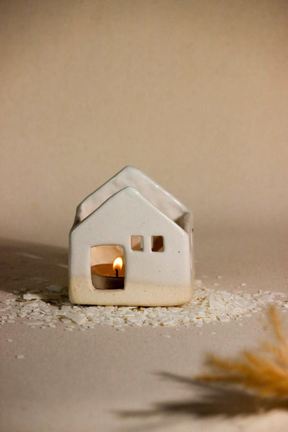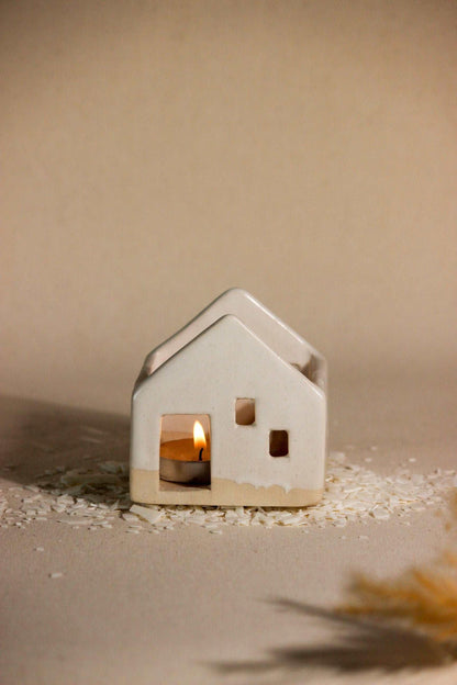 Pristine and pure, the simple aesthetics of this ceramic home with little window cut-outs, create a surreal aura! A stunning decorative masterpiece, it is a must-have for your space, casting a cozy and warm glow. Place a tea light candle from the opening at the top of the house and watch the fantasy come alive. As the ceramic house illuminates, the light will flicker inside the windows, as if a little family was living inside. This handcrafted, timeless sculpture, can remain a centerpiece all year round, making evenings lit and beautiful. Great for living rooms and bedrooms, even without a tealight, this sculpture is sure to bring added flair to your living space. Each piece is handmade by local artists with stoneware clay and finished with in-house glaze. Hence, each piece has its own individual shape, personality, and irregularities. All dimensions are as accurate as possible. However, as with any hand-built item, there could be some variations in size among the pieces.