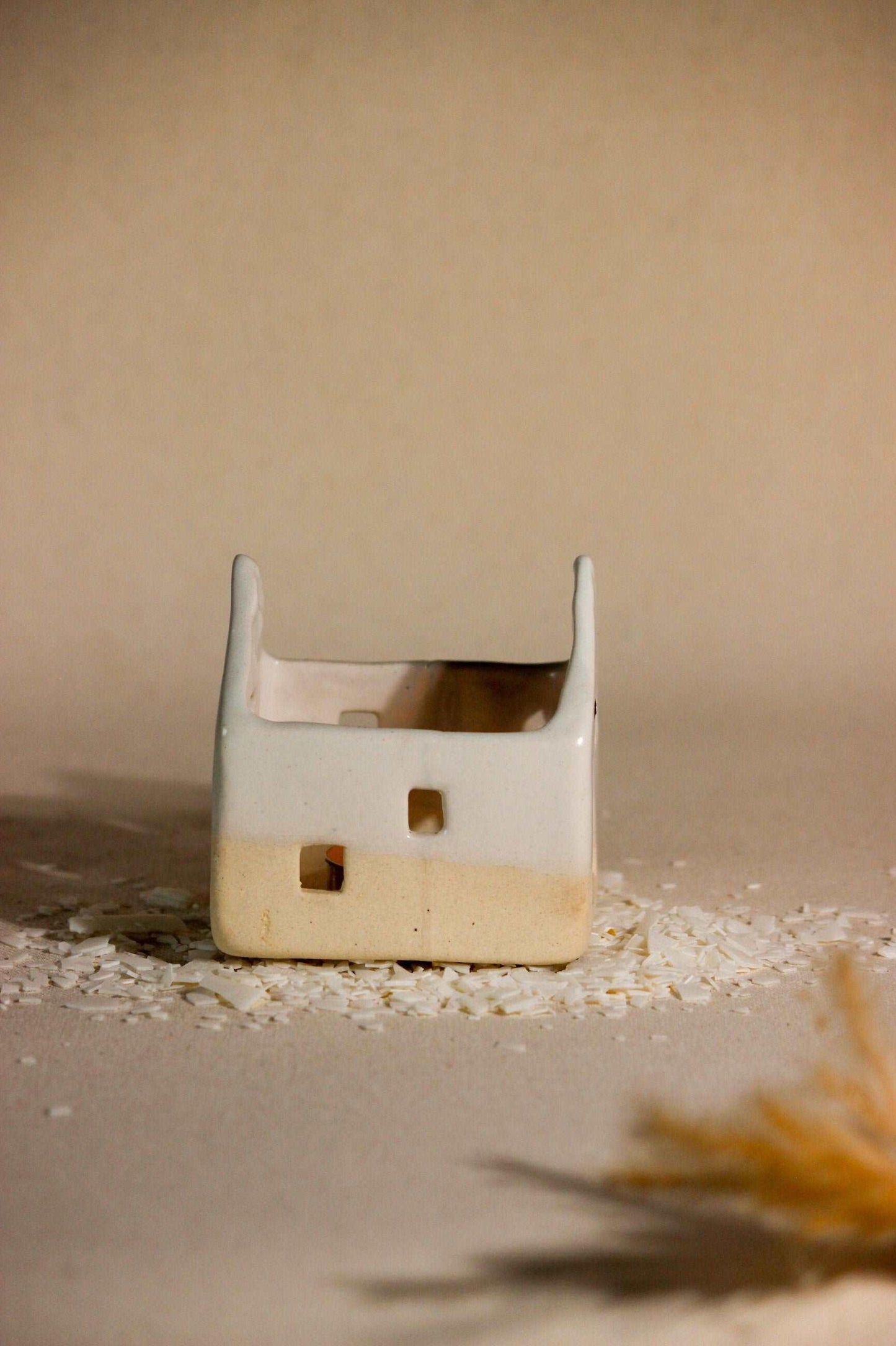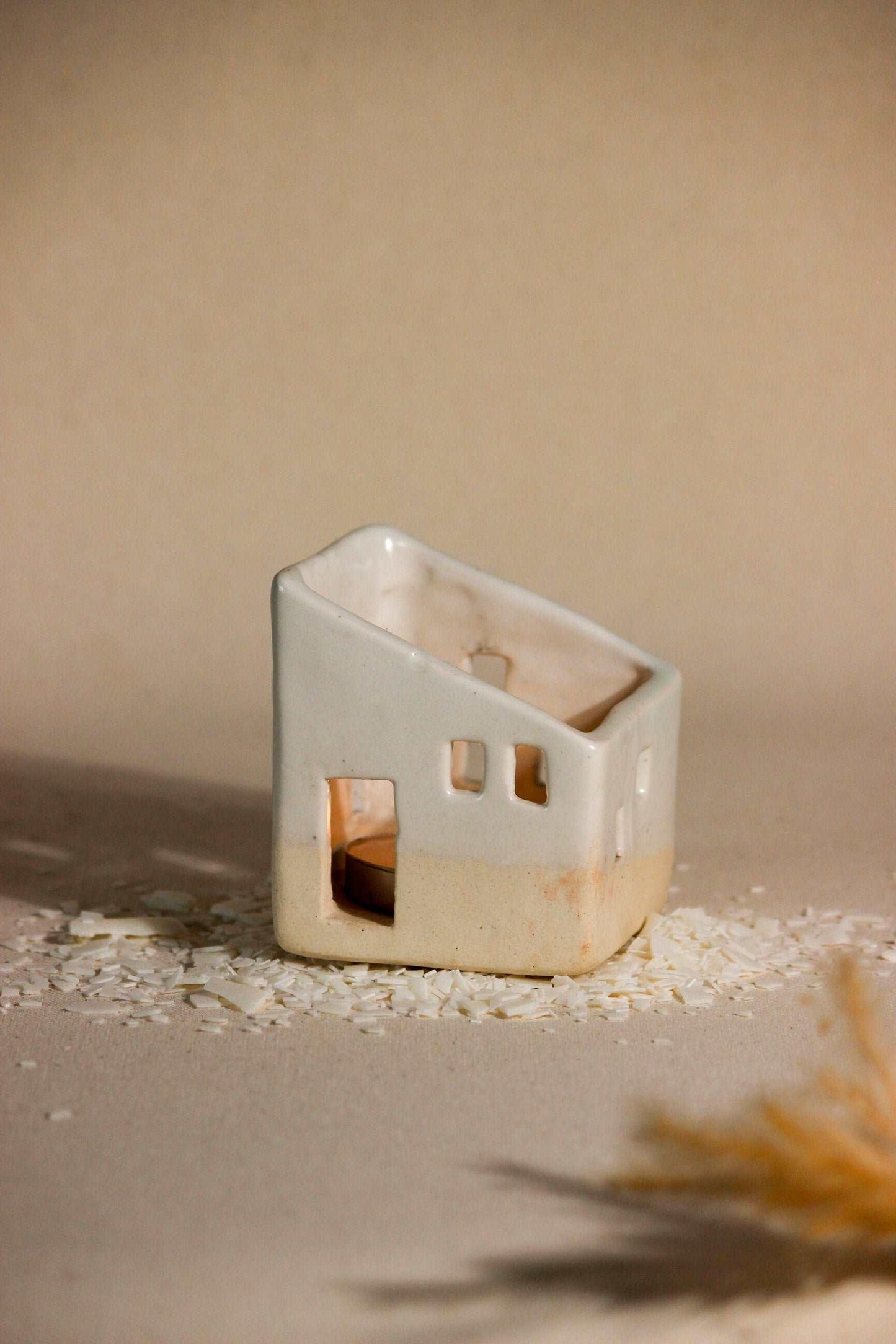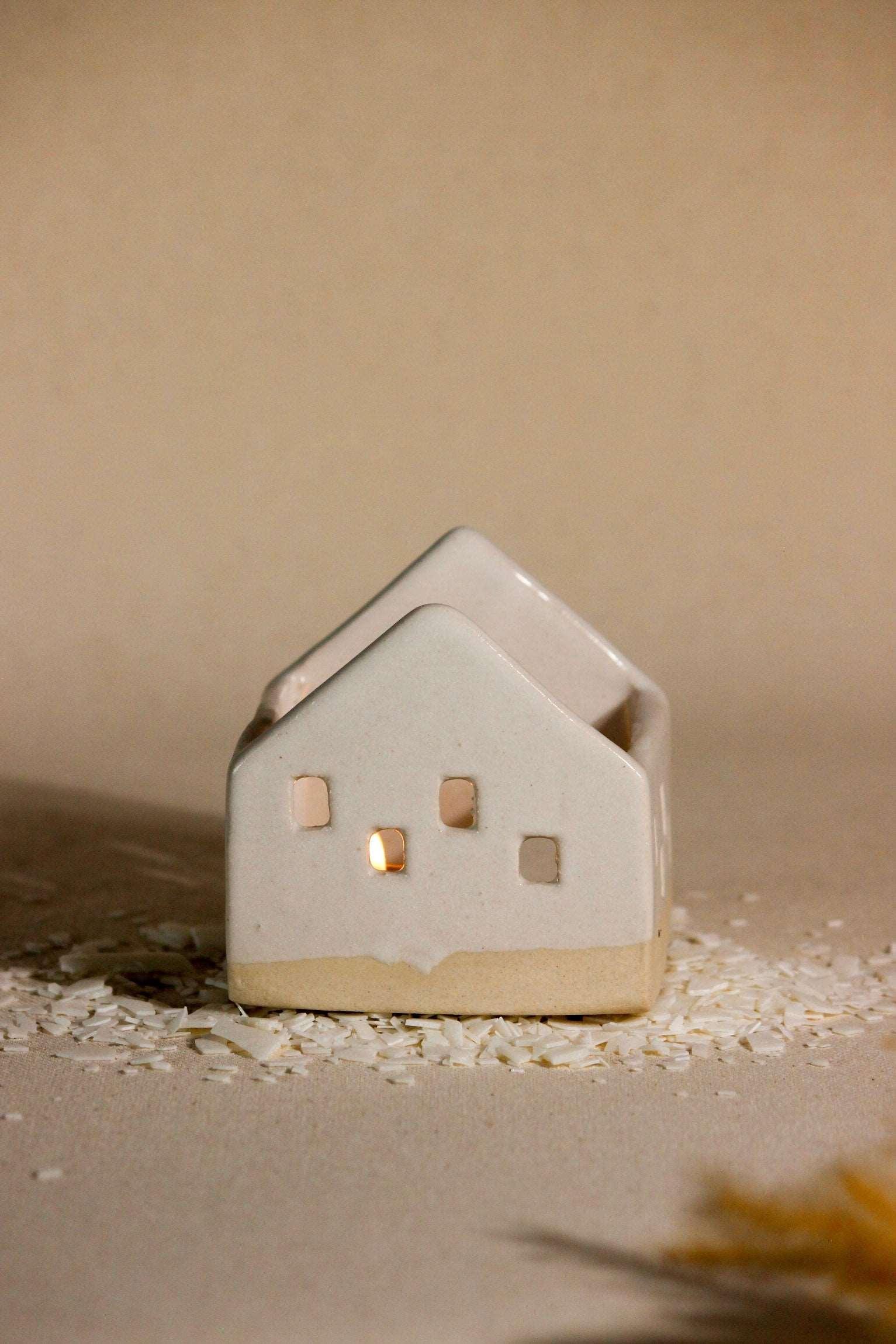 Pristine and pure, the simple aesthetics of this ceramic home with little window cut-outs, create a surreal aura! A stunning decorative masterpiece, it is a must-have for your space, casting a cozy and warm glow. Place a tea light candle from the opening at the top of the house and watch the fantasy come alive. As the ceramic house illuminates, the light will flicker inside the windows, as if a little family was living inside. This handcrafted, timeless sculpture, can remain a centerpiece all year round, making evenings lit and beautiful. Great for living rooms and bedrooms, even without a tealight, this sculpture is sure to bring added flair to your living space. Each piece is handmade by local artists with stoneware clay and finished with in-house glaze. Hence, each piece has its own individual shape, personality, and irregularities. All dimensions are as accurate as possible. However, as with any hand-built item, there could be some variations in size among the pieces.
